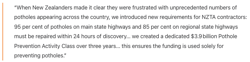 Last week Minister Bishop, this time with his Transport hat on, announced that around 98 per cent of potholes on state highways are now being fixed within 24 hours.