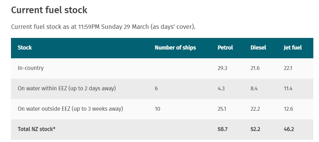 New Zealand's fuel stocks have been updated, showing stable levels across petrol, diesel, and jet fuel. According to the latest MBIE data, the country has 58.7 days of petrol available, 52.2 days of diesel, and 46.2 days of jet fuel. This data was collected by fuel companies at 11:59 pm Sunday, March 29.