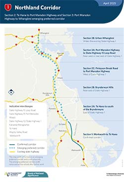 “For Section 2, Te Hana to Port Marsden Highway, the emerging preferred corridor is a new route to the east of SH1 between Te Hana and the Brynderwyn Hills, near to the east of SH1 at the Brynderwyn Hills and to the west of SH1 between the Brynderwyn Hills and Port Marsden Highway.