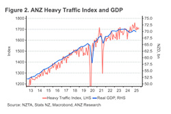 Light traffic (motorbikes, cars and vans) is generally a good indicator of the state of demand, as opposed to production. It typically provides up to a six-month lead on momentum in the economy, with variation reflecting discretionary spending on outings, movement of couriers and tradespeople etc. The trend in light traffic has lifted in the last few months. In per capita terms (using ANZ population forecasts), light traffic has also turned higher.