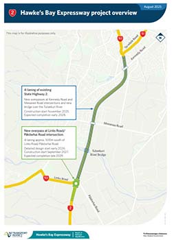 The investment case for Hawke’s Bay Expressway corridor includes: 7km of four-laning between Links Road/Pākōwhai Road and Taradale Road. A duplicate two-lane overpass at Meeanee Road. A duplicate two-lane overpass at Kennedy Road. A duplicate two-lane bridge over Tutaekuri River. A four-lane grade separated interchange at Links Road/Pākōwhai Road.