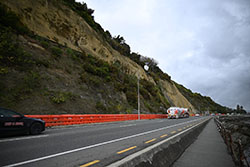 A rocky cliffside with greenery overlooks a coastal road. A tanker truck and a car drive past orange barriers. Overcast skies create a somber tone. SH6 Rocks Road work site