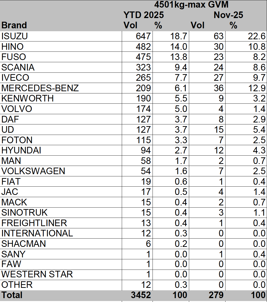 The November figures extend Isuzu’s 2025 market leadership with 647 registrations YTD and 18.7% market share with Hino (30/482) just edging ahead of Fuso (23/475) for second position and Scania (24/323) remaining in fourth position.