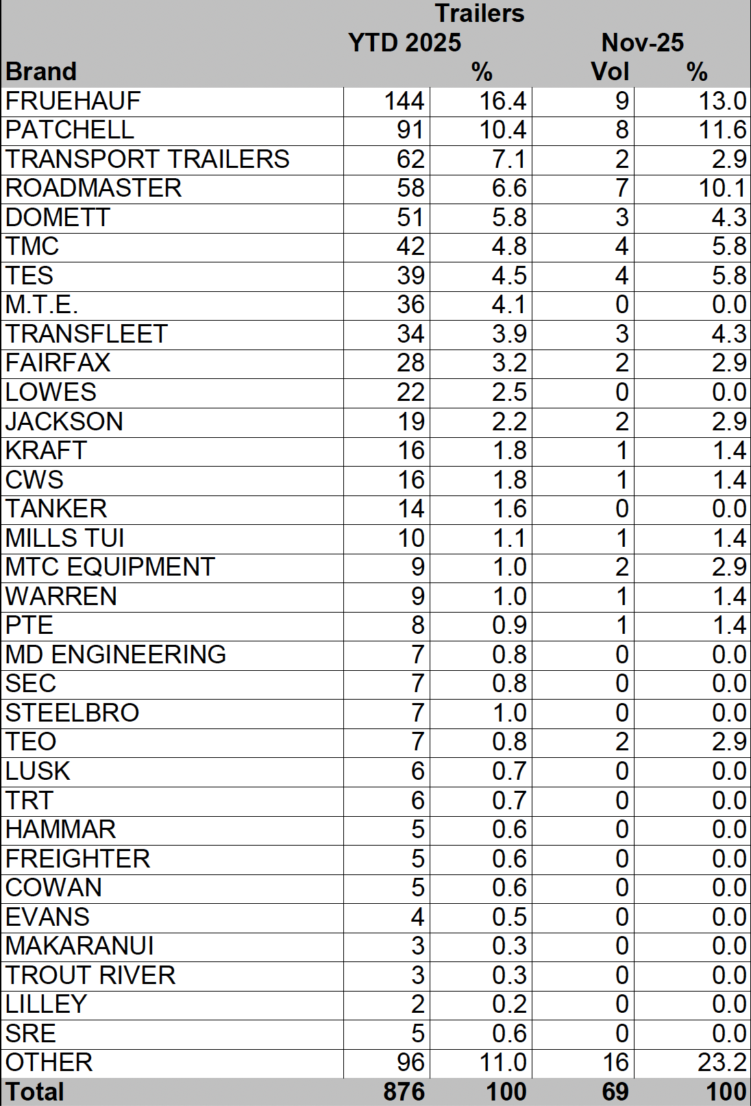 New trailer registrations of 69 units in November are well down on 113 units in the corresponding month last year and the trailer market now totals 876 registrations YTD – down from 1336 in the first 11 months of 2024.